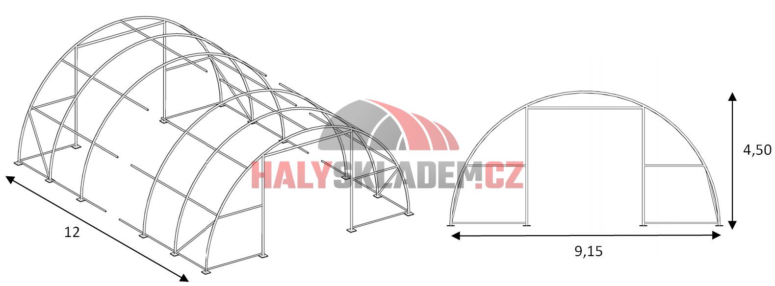 Montovaná ocelová konstrukce haly velikostí šířka 9,15 m x délka 12 m x výška 4,5 m s životností až 25 let. Určena pro celoroční venkovní použití. Opláštit konstrukci lze dle potřeby využití z nejrůznějších materiálu (trapézový plech, folie, stínící síťě apod.)
